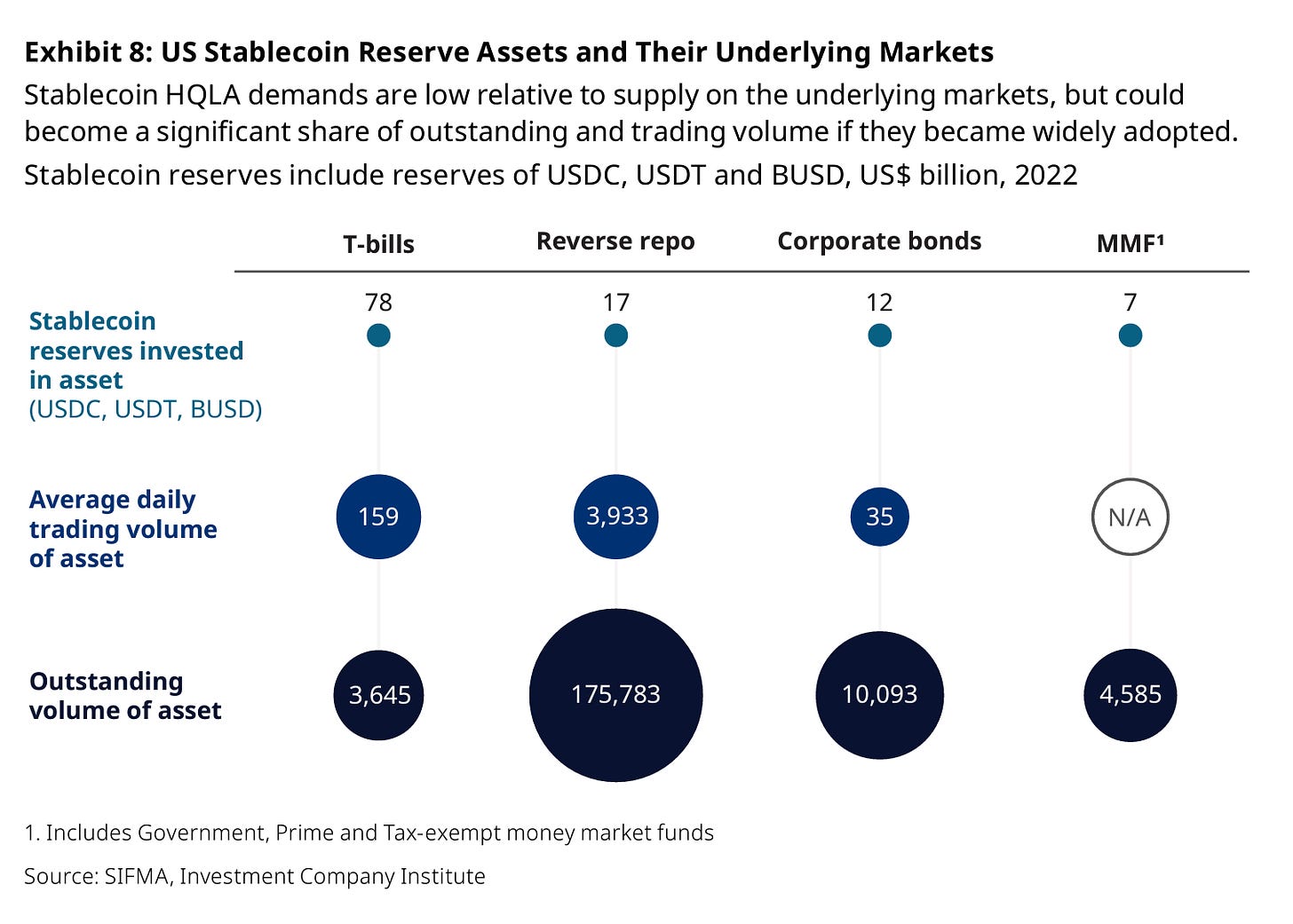 This diagram from JPM illustrates the types of HQLA: T-bills, reverse repos, corporate bonds and money market funds (MMFs). It tend goes on to compare the amount of stablecoin reserves invested in the asset, the average daily trading volume of the asset, and the outstanding volume of the asset.