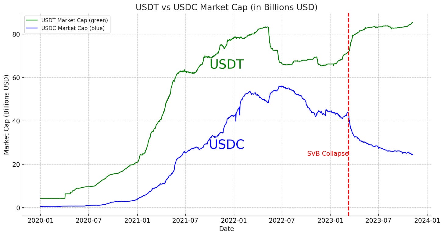 The ill-fated collapse of SVB in March 2023 is the most significant incident in 2023 for stablecoins, causing migration from USDC into USDT. Circle had 8% of collateral in SVB, causing a depeg of USDC to a low of 0.86. It highlighted the interconnectedness of the traditional banking system with stablecoins.